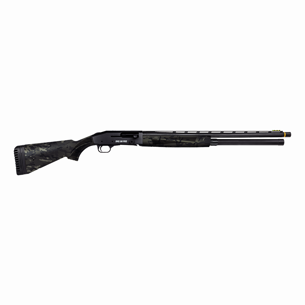 Mossberg 940 com acabamento camuflado. Perfeita para caça em ambientes naturais.